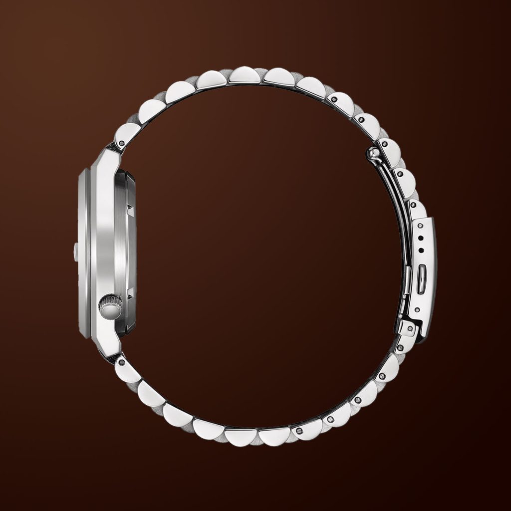 Integrada à caixa, a pulseira em aço inoxidável segue a linguagem dos relógios esportivos clássicos com design integrado, oferecendo continuidade visual e conforto no pulso. O fecho dobrável com botões de segurança garante firmeza e praticidade no uso diário. Com resistência à água de até 50 metros, o Tsuyosa “Time Slip” está preparado para a rotina urbana, suportando respingos e uso cotidiano com tranquilidade.