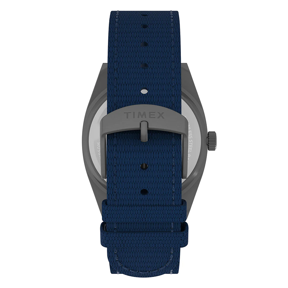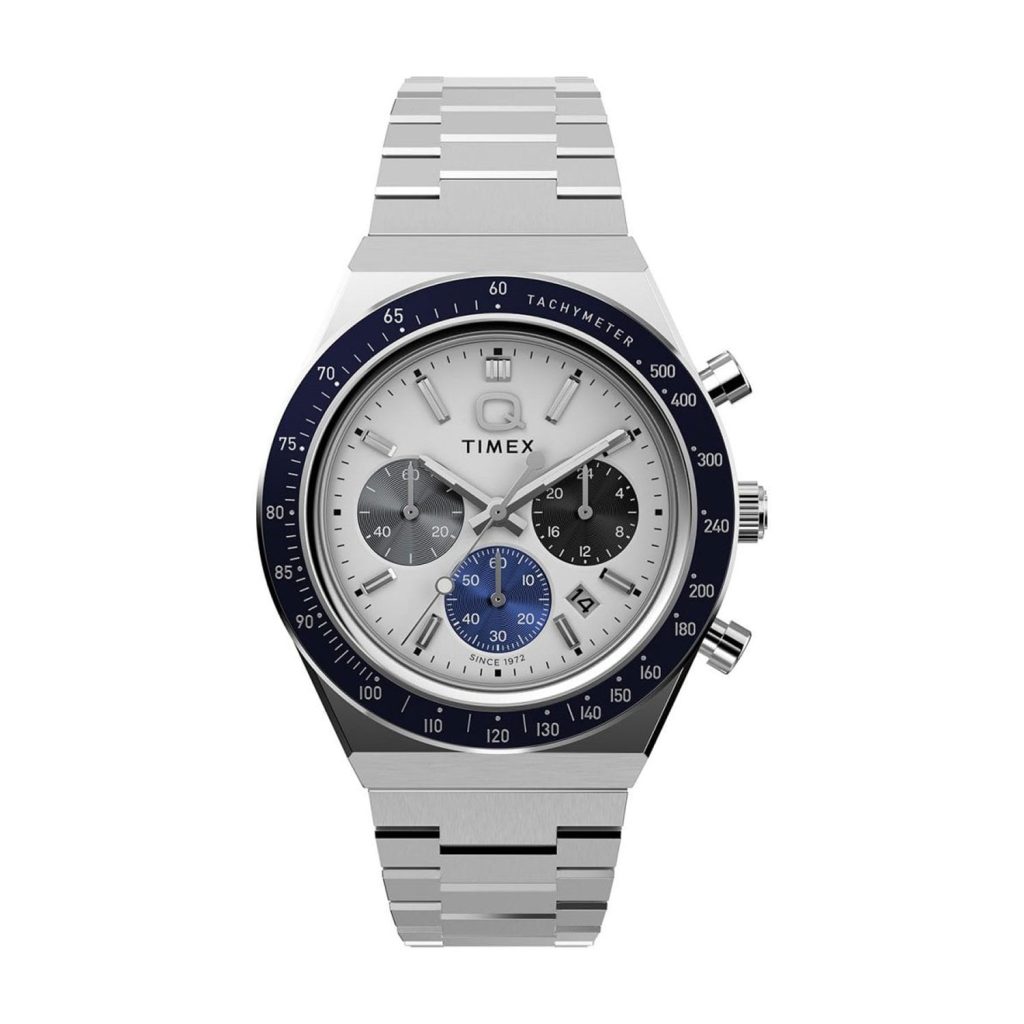 O Timex Q Chronograph TW2Y36200 é uma reinterpretação moderna dos relógios de corrida dos anos 1970, combinando estética vintage com funcionalidades contemporâneas. Com caixa de 40 mm em aço inoxidável reciclado, o modelo apresenta um mostrador branco com três subdials contrastantes: azul, cinza e preto, além de um bezel azul com escala taquimétrica. O design inclui índices aplicados e logo “Q Timex” atualizado, mantendo a essência dos modelos clássicos da marca.