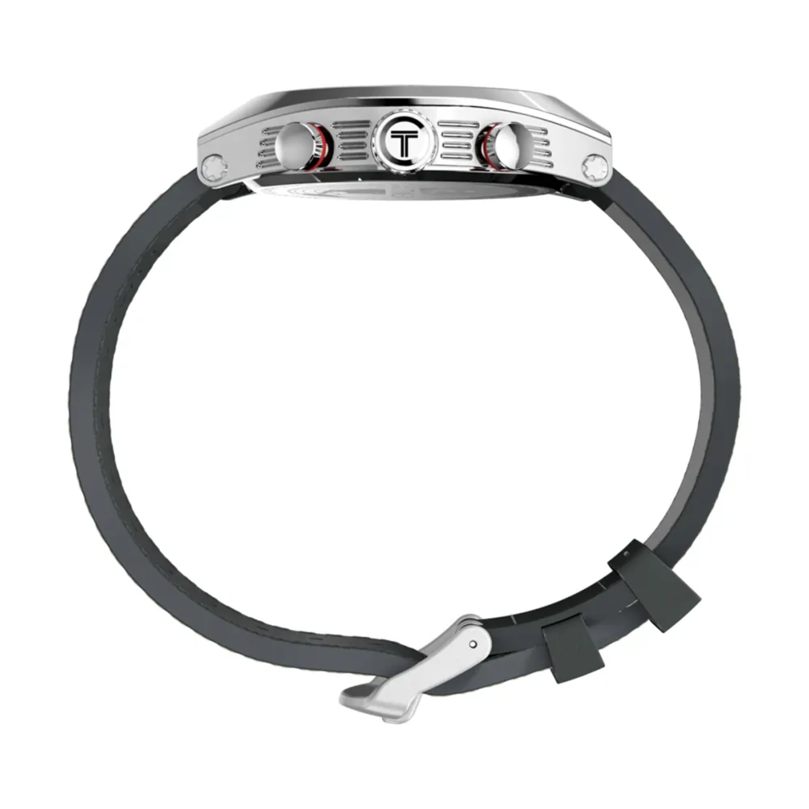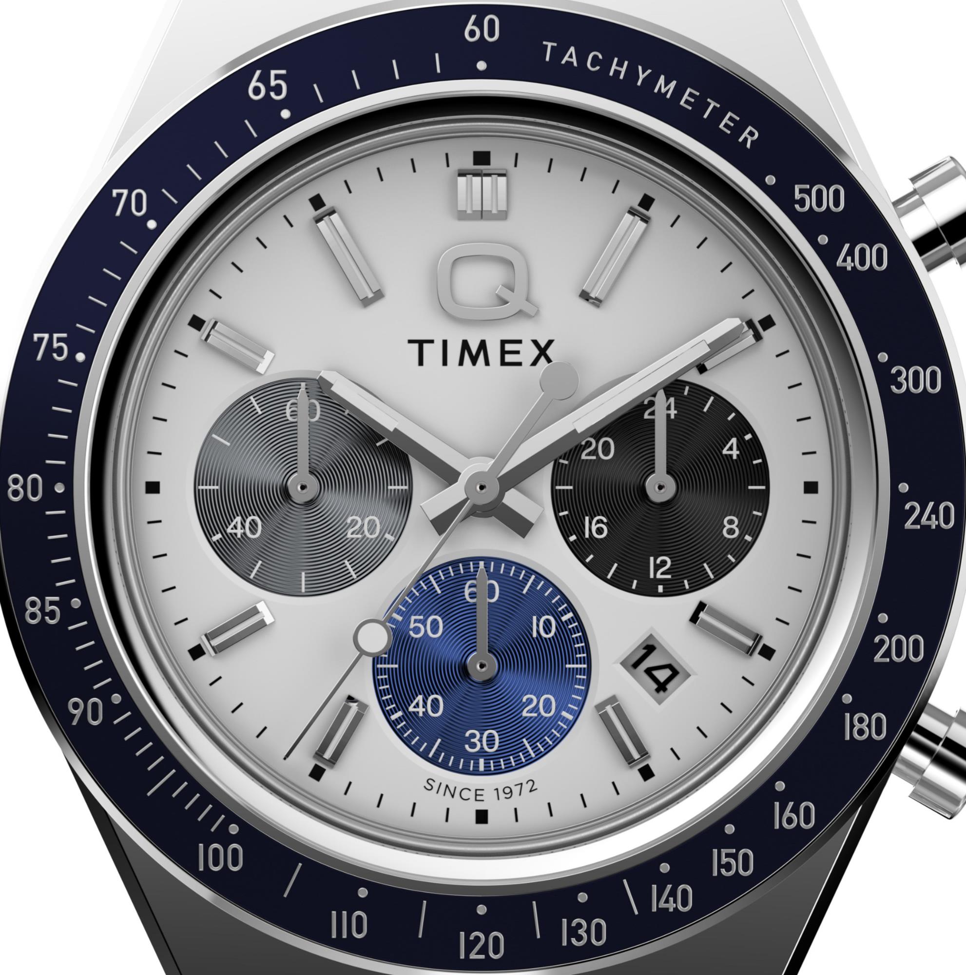 O Timex Q Chronograph TW2Y36200 é uma reinterpretação moderna dos relógios de corrida dos anos 1970, combinando estética vintage com funcionalidades contemporâneas. Com caixa de 40 mm em aço inoxidável reciclado, o modelo apresenta um mostrador branco com três subdials contrastantes: azul, cinza e preto, além de um bezel azul com escala taquimétrica. O design inclui índices aplicados e logo “Q Timex” atualizado, mantendo a essência dos modelos clássicos da marca.