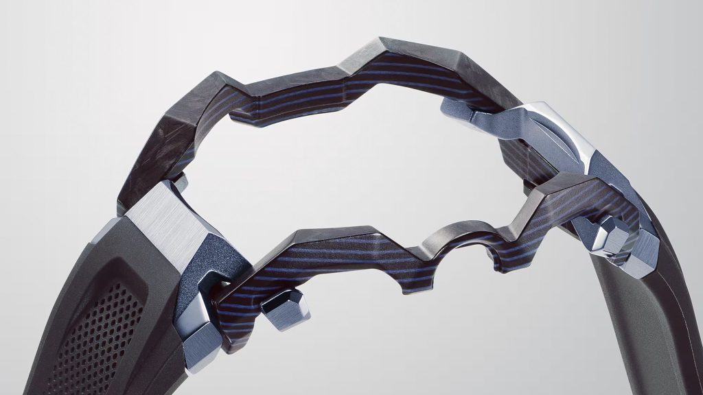 E se por um lado o carbono entrega leveza e absorção de impacto, o aço assume o papel de sofisticação. O B4000 apresenta um acabamento metálico cuidadosamente trabalhado, com superfícies polidas e escovadas que criam contraste e refletem luz de maneira sólida e precisa.